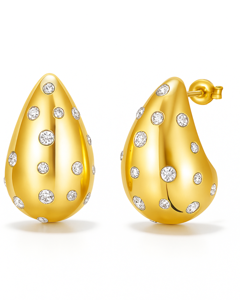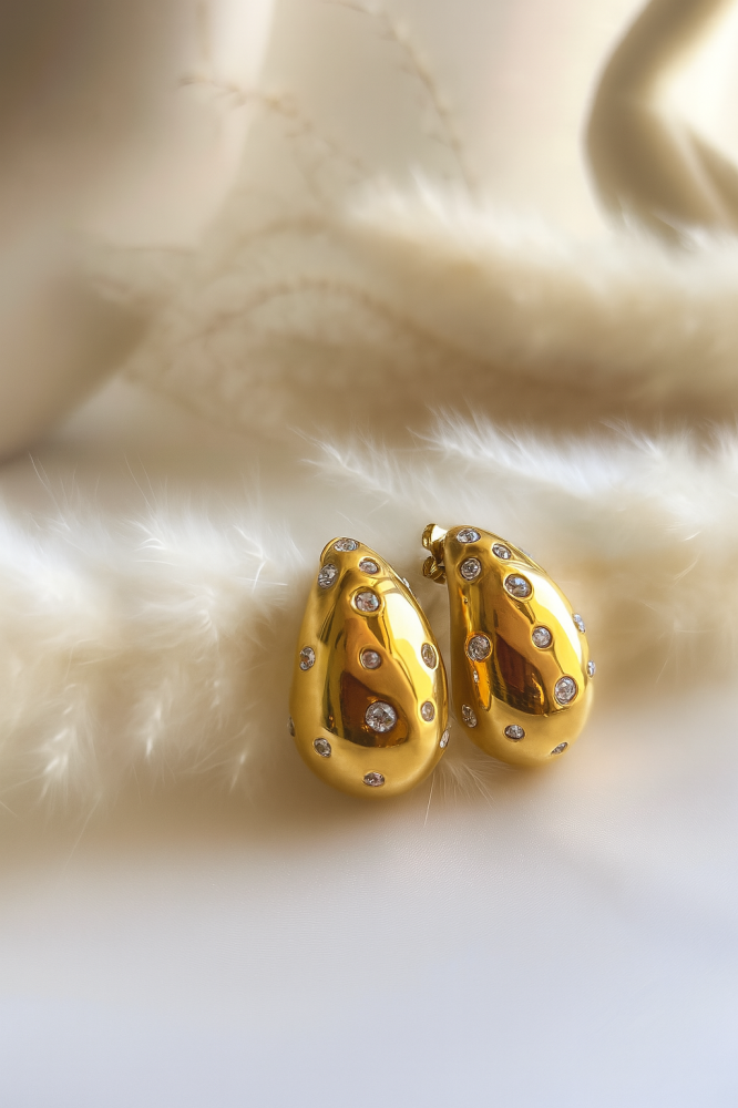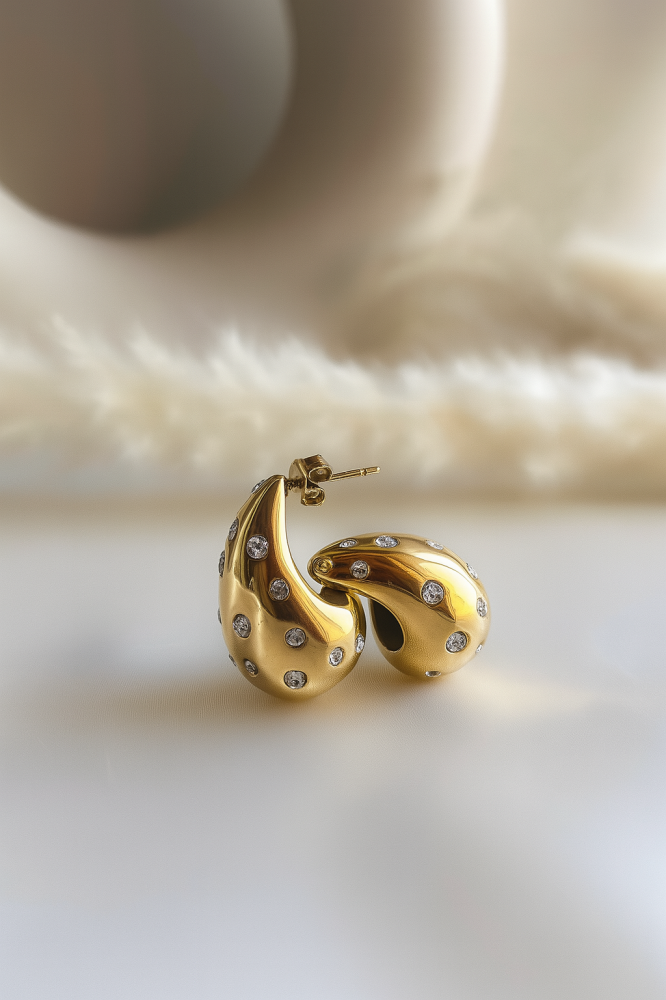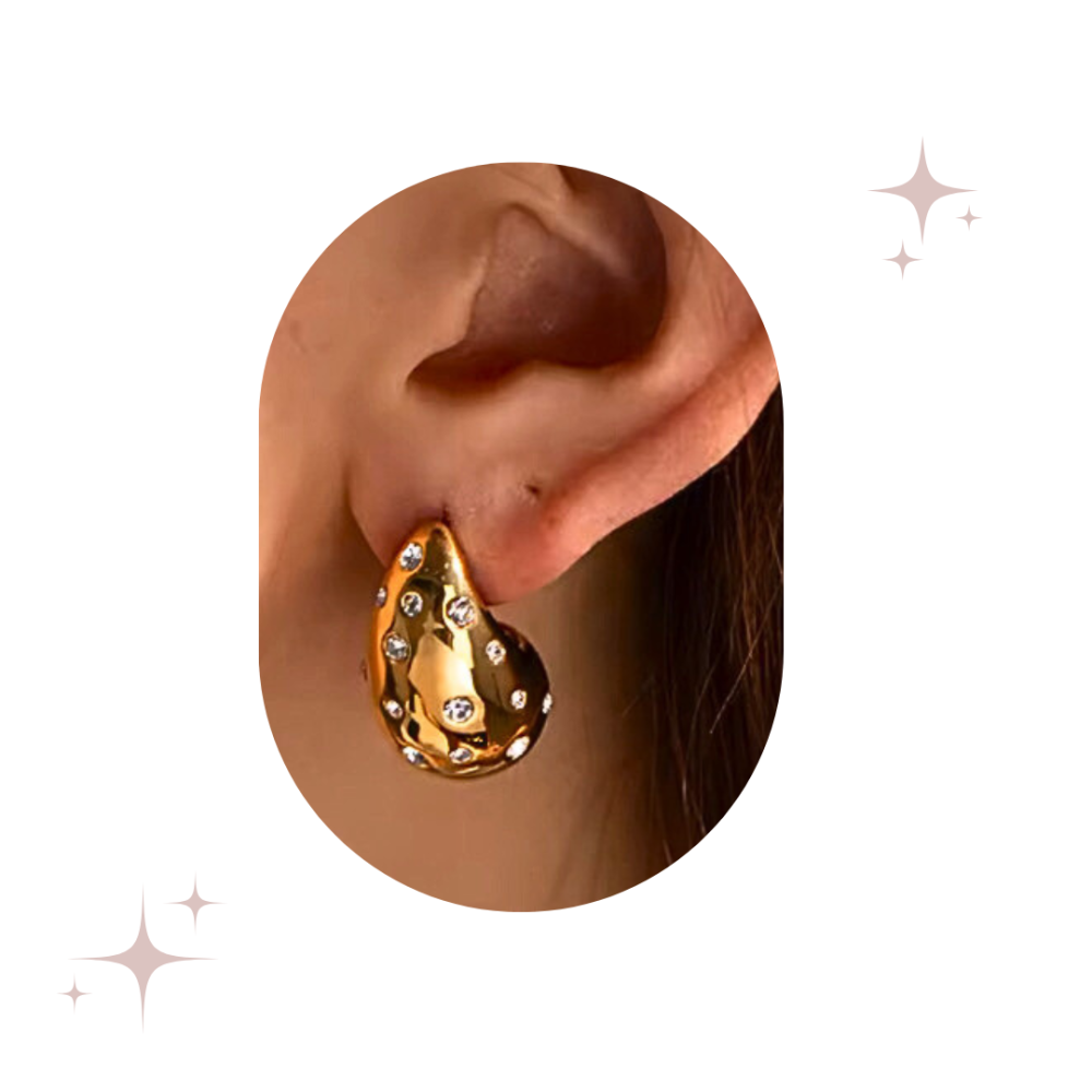 أضيفي لمسة من التميز والفخامة إلى إطلالتك مع أقراط اللوز الذهبية المرصعة بالأحجار اللامعة. تصميمها الانسيابي يعكس الأناقة العصرية ويجعلها خيارًا مثاليًا للمناسبات أو الاستخدام اليومي الراقي.
