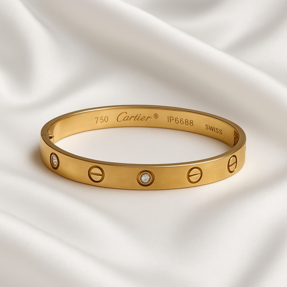 هذه الاسوارة الأنيقة والجذابة مستوحاه من تصميمات كارتيه الأيقونية، حيث تجسد الرقي والبساطة في آن واحد. الاسوارة مصنوعة من الفولاذ المقاوم للصدأ، مما يضمن المتانة والمظهر الأنيق الذي يدوم طويلاً. مطلية بطبقة من الذهب عيار 18 تمنحها لمسة من الفخامة والدفء مع بريق جذاب يلفت الأنظار.