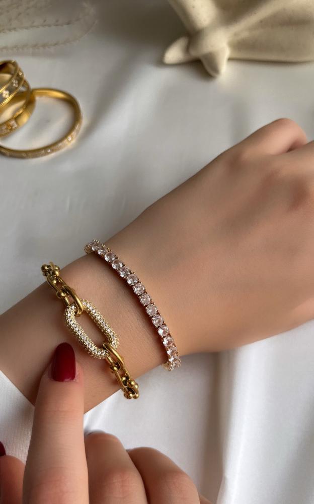 تمتاز الأساور بتصميم أنيق ومبهر، حيث تتوسطها سلاسل رفيعة ومتألقة، مع ثبات أحجار الزركون اللامعة التي تلمع كالالماس على كل جانب. بالإضافة إلى ذلك، فإن الطلاء بالذهب عيار 18 يضفي لمسة من الفخامة والتألق الفريدة.
