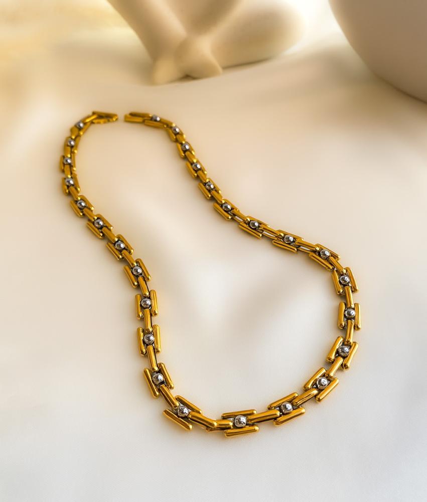 تميّزي بإطلالة فاخرة مع هذا العقد الذهبي الراقي المصمم بتفاصيل هندسية متقنة. يأتي بتصميم سلسلة معدنية مرصعة بكريات ناعمة تمنحه مظهرًا عصريًا أنيقًا، ما يجعله خيارًا مثاليًا لإطلالة يومية راقية أو مناسبة خاصة .