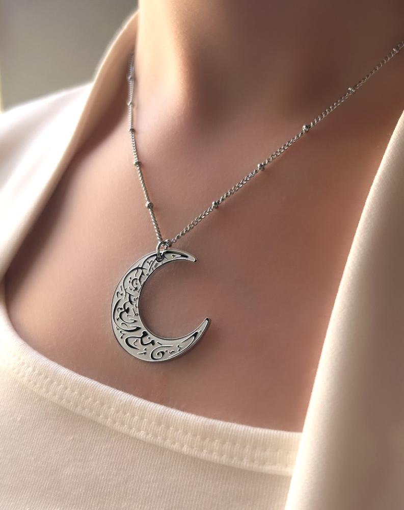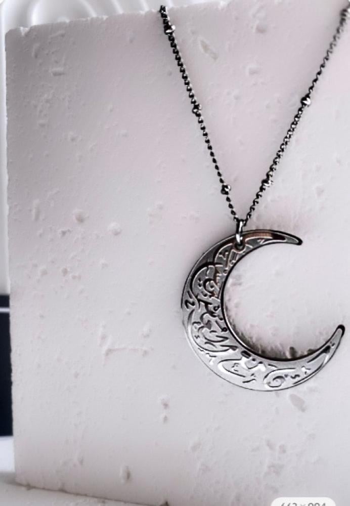 استعدي لإضفاء لمسة من الأناقة والتفاؤل إلى إطلالتك مع هذا السلسال الرائع على شكل هلال، المزين بعبارة ملهمة مكتوبة باللغة العربية: "إن مع العسر يسرا". يعكس هذا السلسال روح التحدي والأمل بطريقة جذابة وملهمة.